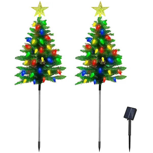 2Pack 37.4in Height Solar Christmas Tree With Colorful LED Beads 8 Lighting Modes For Xmas Decoration IP44 Waterproof Outdoor Pathway Stake Light