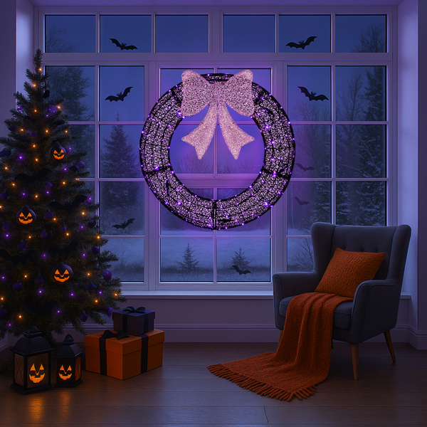 1. Holiday Wreath & Purple Bow: Elevate your holiday decor with this eye-catching wreath and elegant purple bow. Its festive design will transforming your gate, garage, or exterior walls into a dazzling Christmas display.