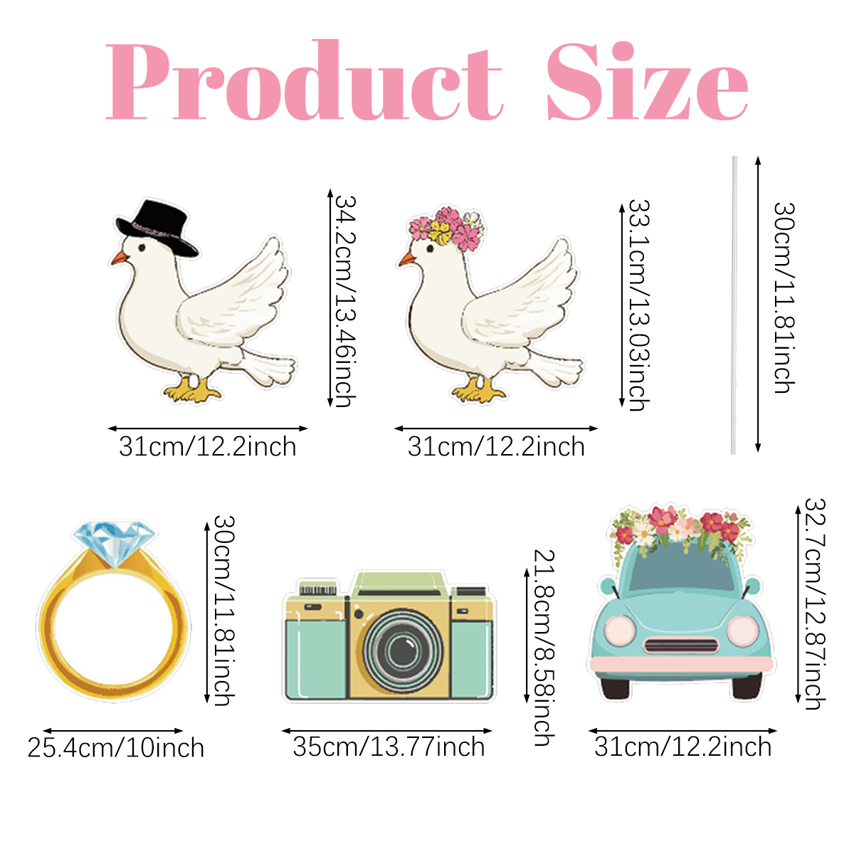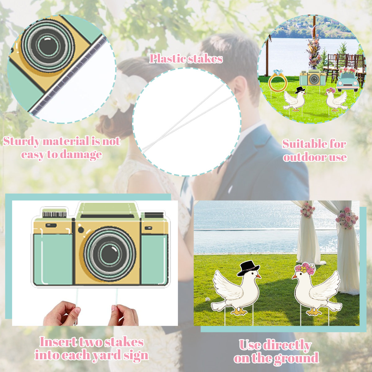 Home > 5 Pieces Wedding Theme Party Yard Signs With Stakes Pigeon Ring Camera Pattern Road Decoration Wedding Reception Plastic Welcome Sign Large Brida