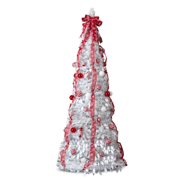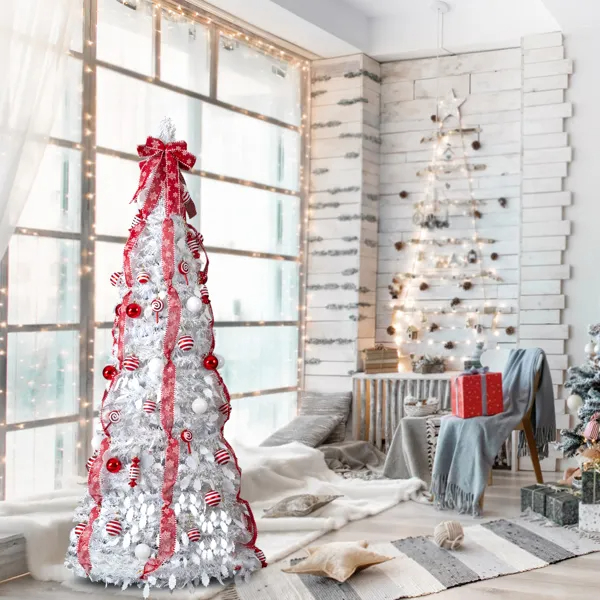 1. Fully Decorated: This fully decorated pop-up Christmas tree takes the stress out of holiday decorating. With its lifelike branches adorned with various styles of balls, white leaves, twinkling fairy lights, candies and ribbons, it brings festive magic to your space in seconds—no additional decor needed.