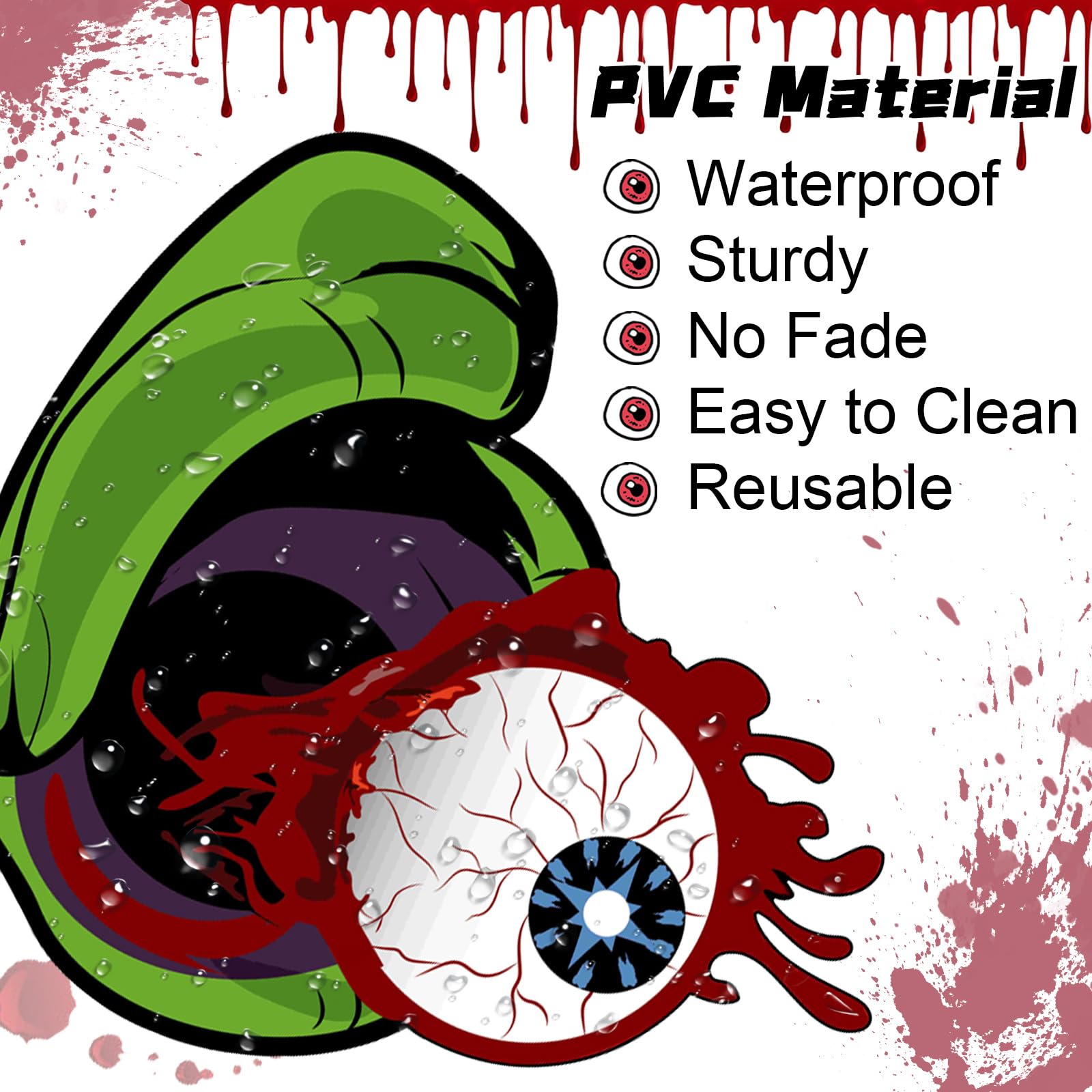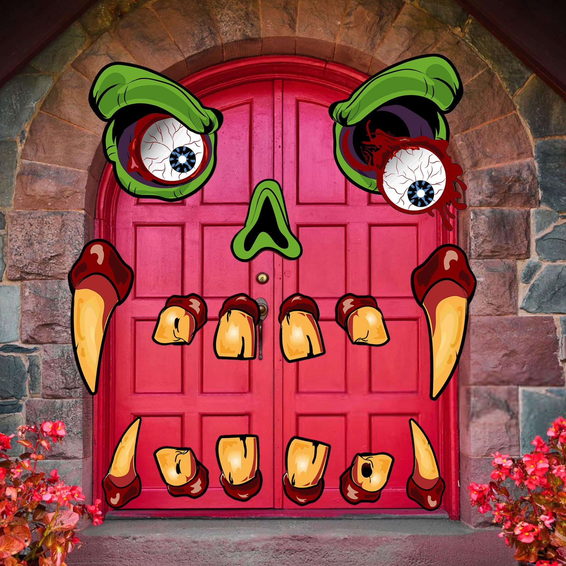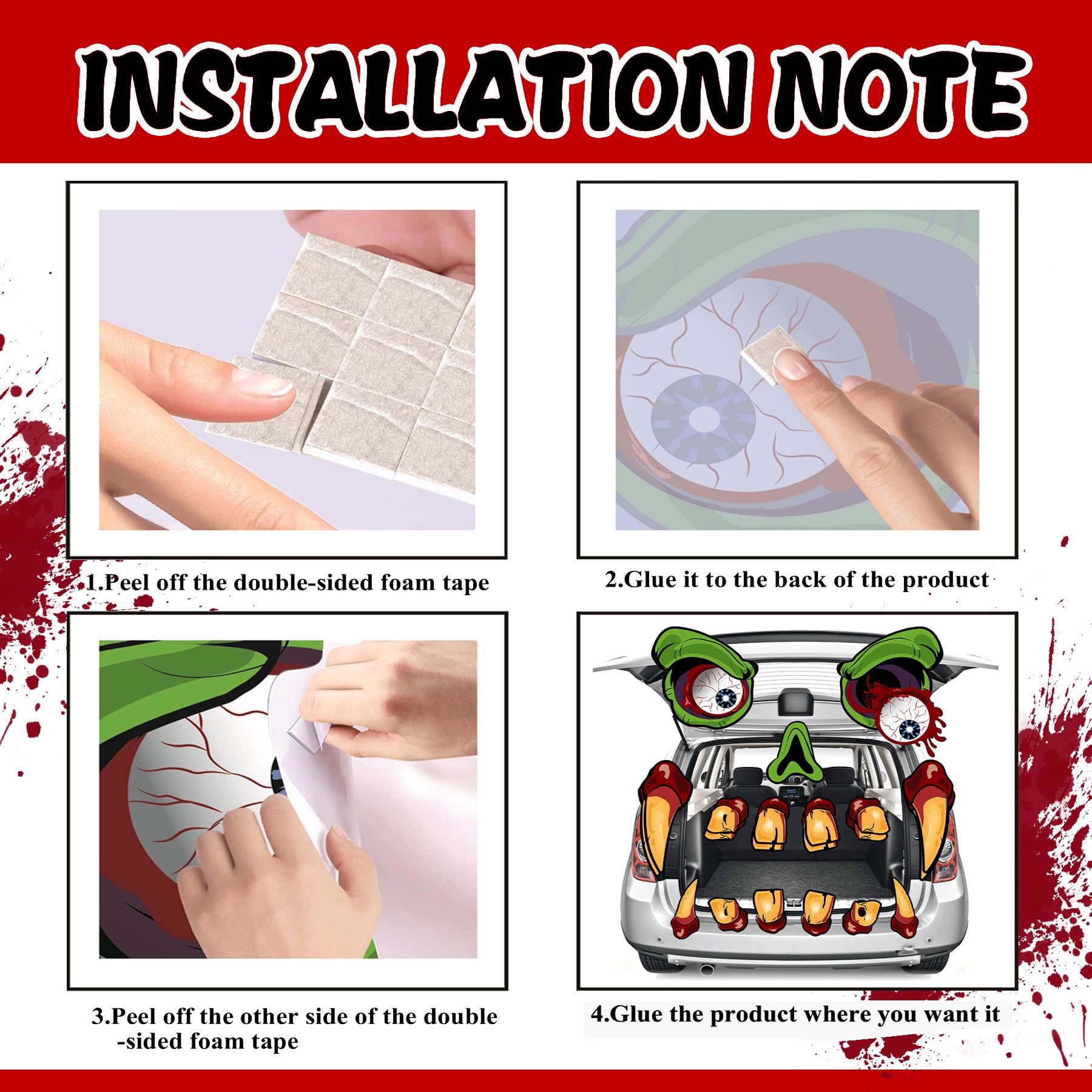 The package includes 15pcs stickers with 2 eyes, 1 nose and 12 fangs, as well as double-sided foam tape and installation instruction for easy application.To create a fun and spooky look for your vehicle with this monster face decoration kit