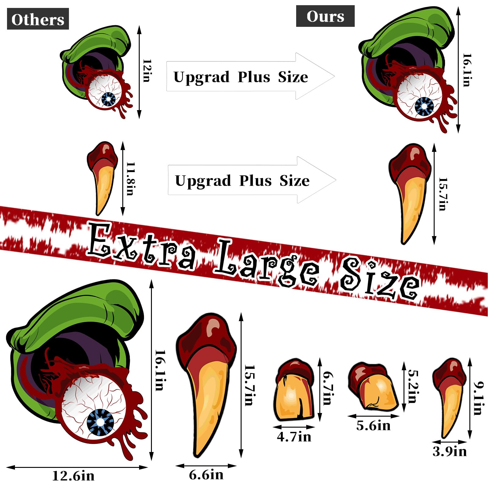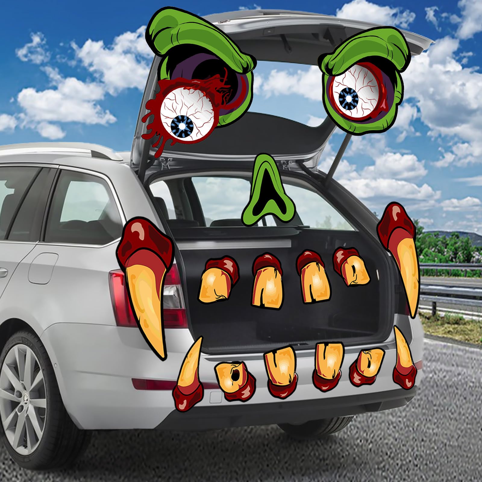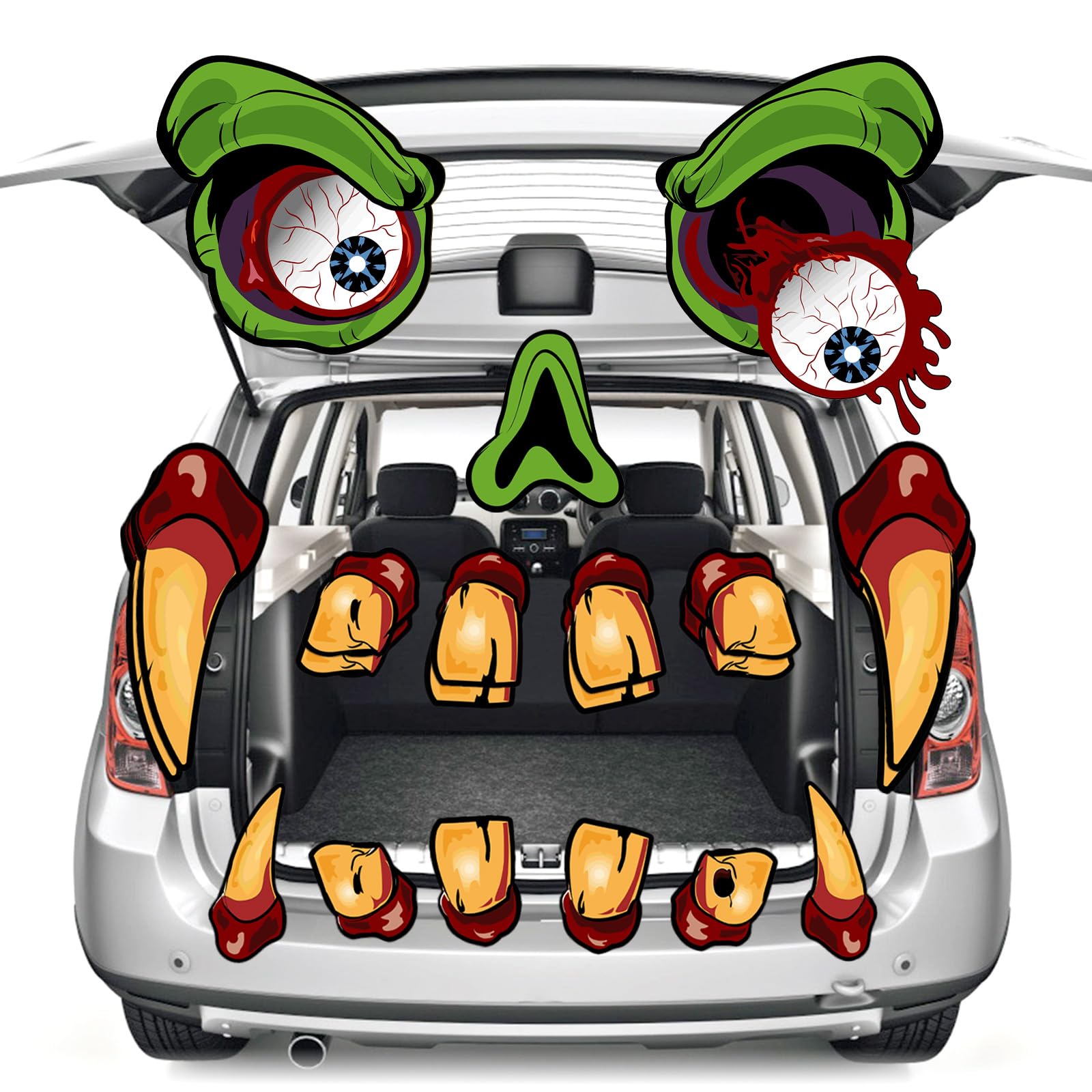 Our Halloween car decorations feature a large size design that is sure to crate a lifelike look.The eyes measure about 12 inches, the noses measure about 7.8inches, fangs rang from 2.5inches to 12inches.These spooky pieces are ideal for trunk or treat car decorations and will add a touch of Halloween magic to your vehicle