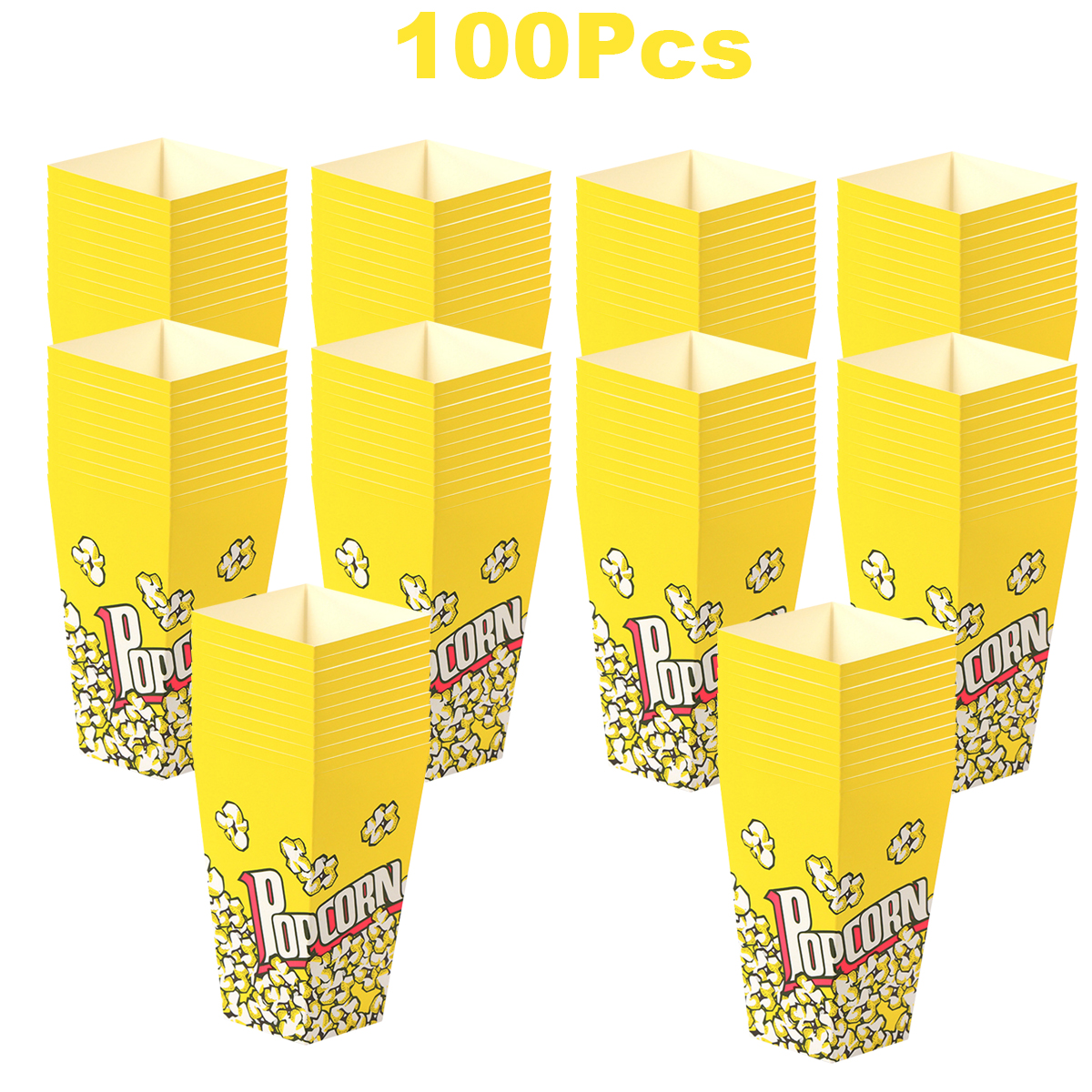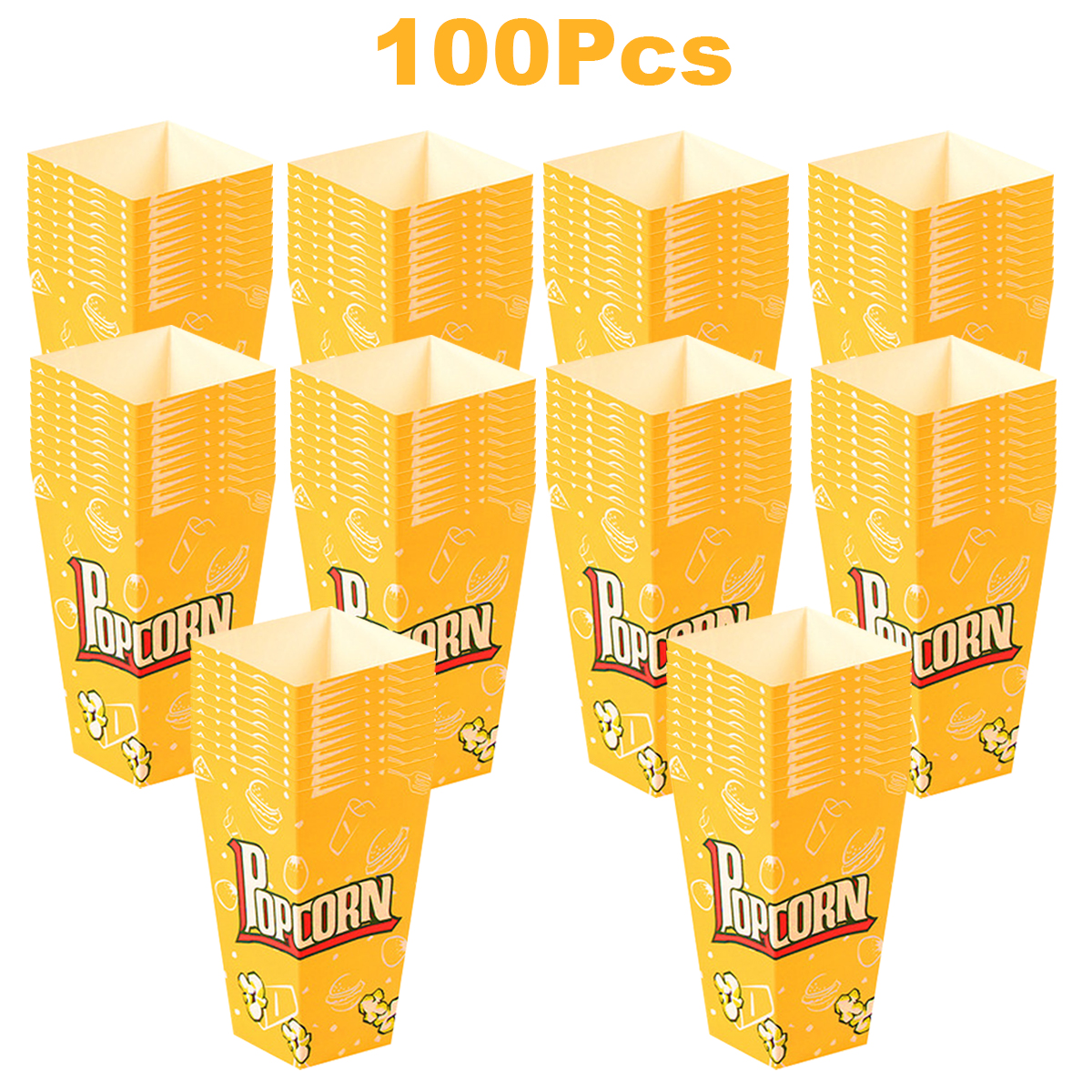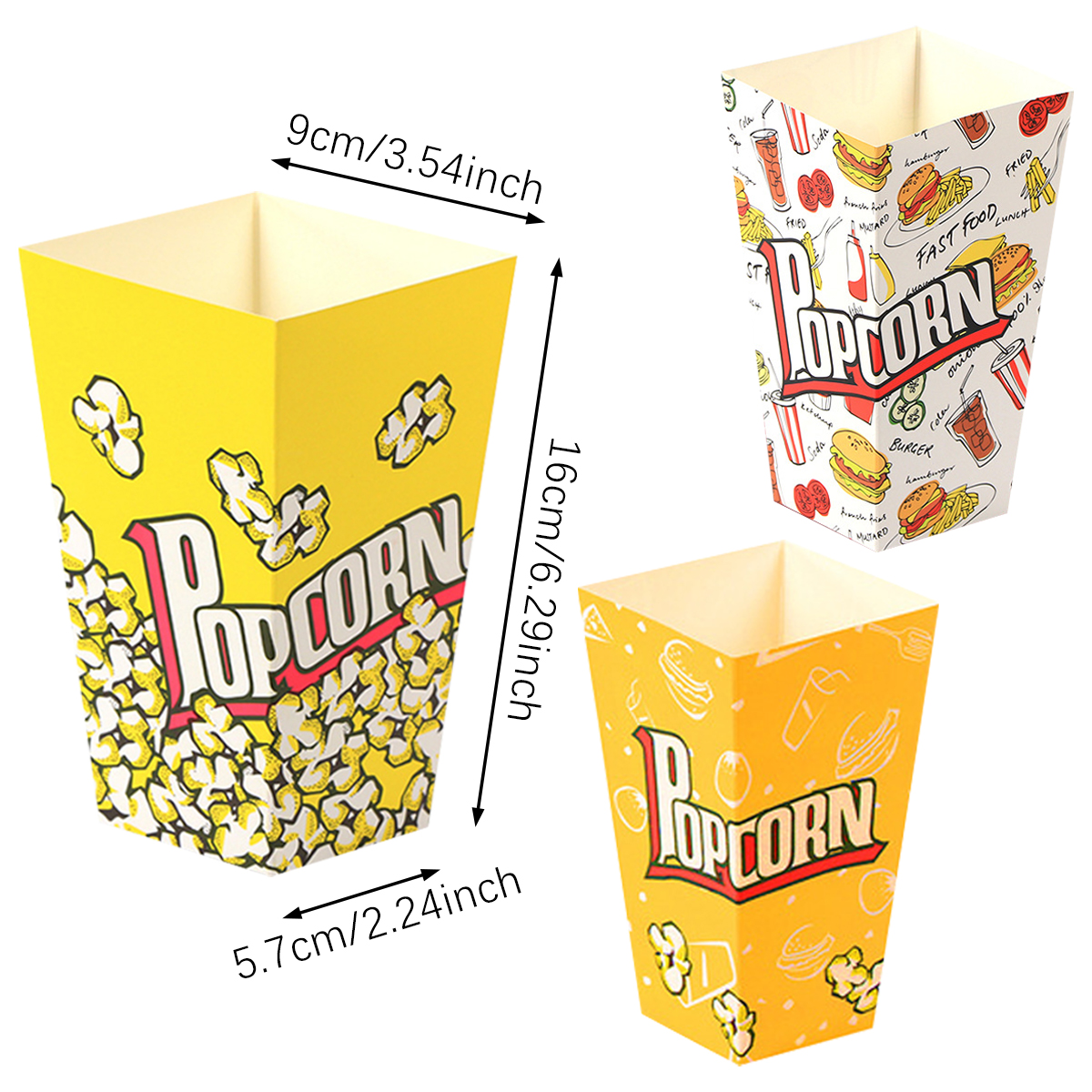 Specifications Material:Paper Color: Yellow, Orange, White Size:16*9* 5.7cm/6.29*3.54*2.24inch Package contents: 100Pcs Paper popcorn box