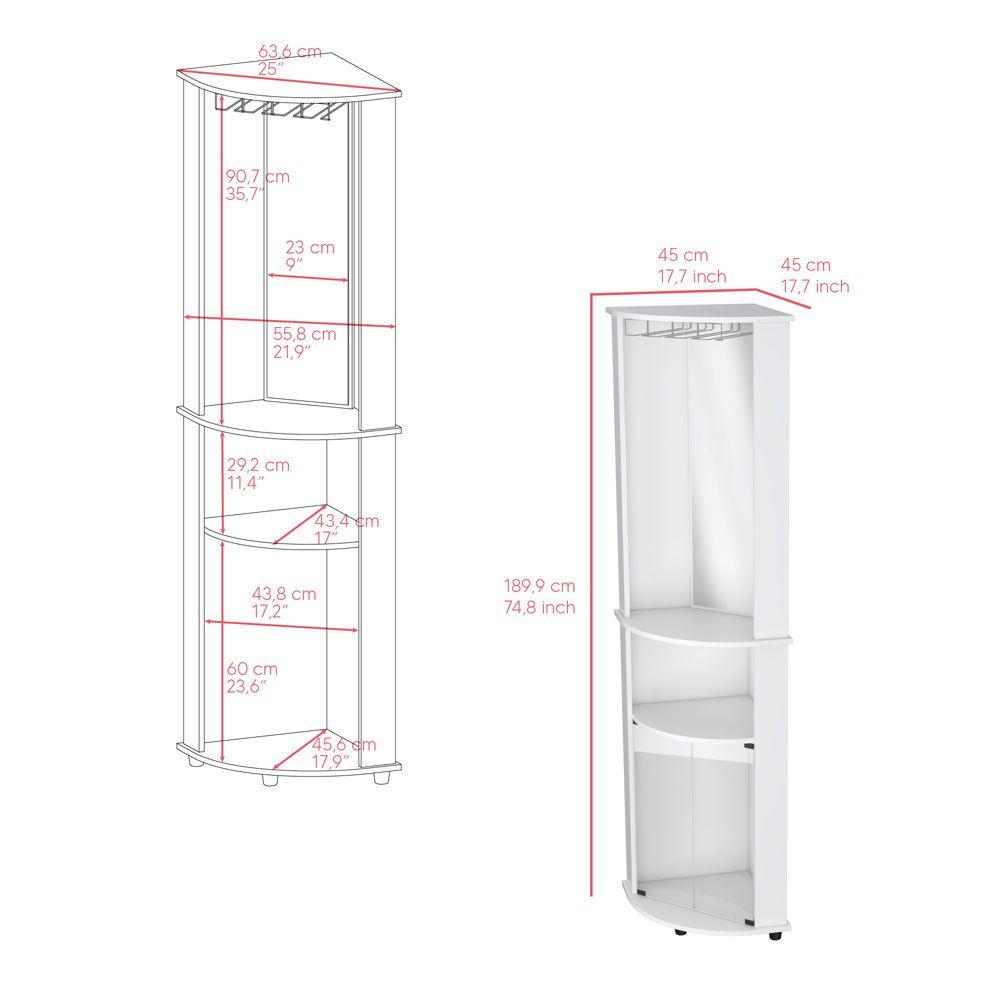 Rialto corner bar cabinet This elegant and stylish corner bar is ideal for any home looking to add a touch of exclusivity. Built-in storage makes it easy to keep your most desired drinks and snacks close at hand. Includes ample storage with three shelves (35.7" H x 21.9" W), make your next party one to remember with the Essential Corner Bar. Designed with an elegant White-manufactured wood finish.