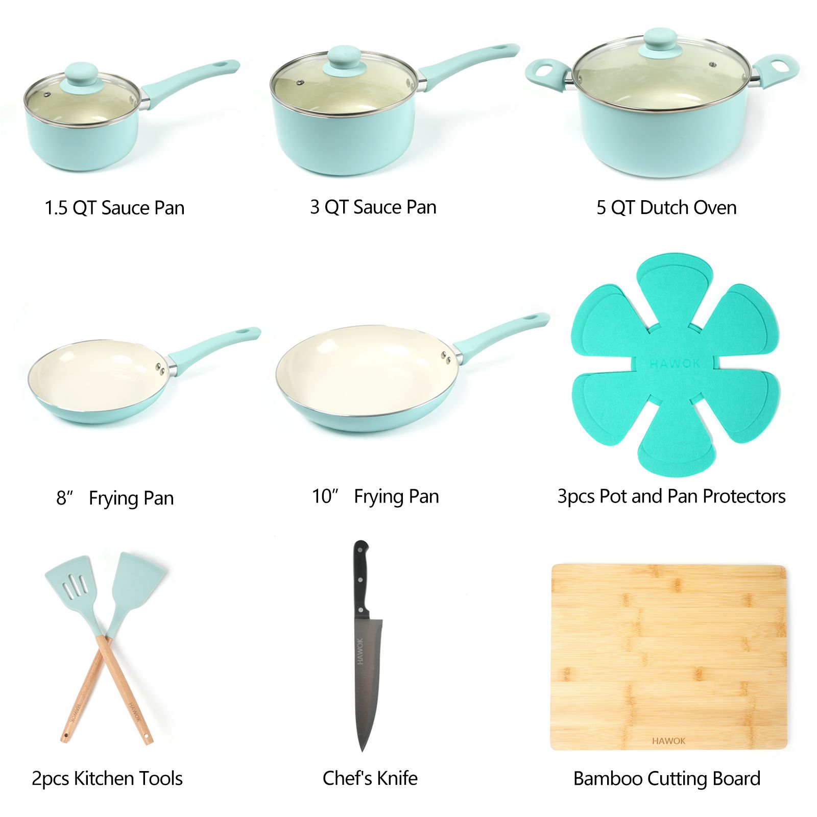 HAWOK kitchen cookware sets feature long-lasting ceramic nonstick coating, makes cooking an enjoyable thing and cleaning a breeze.