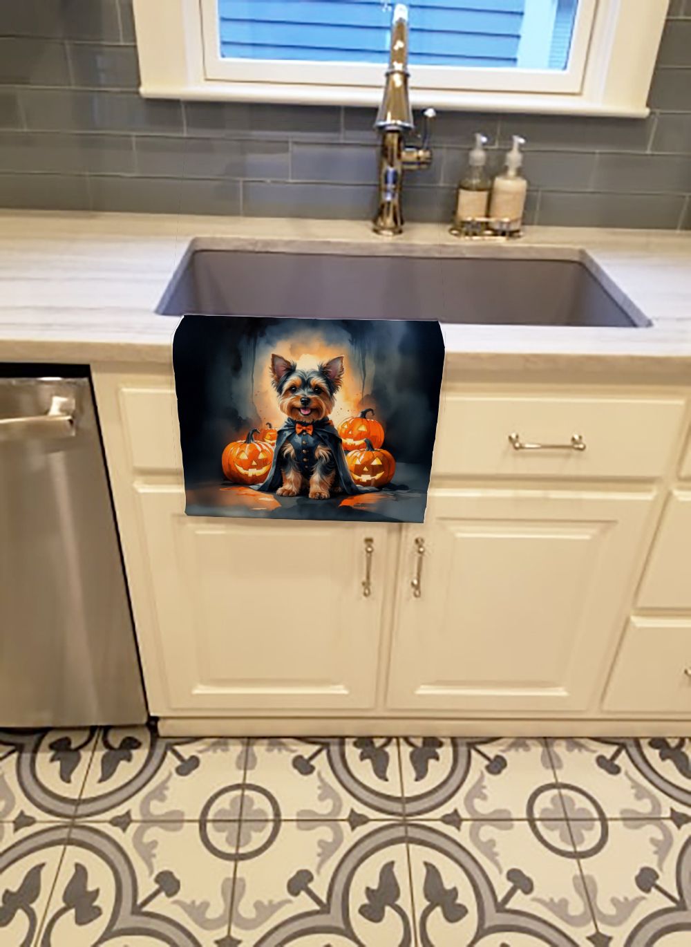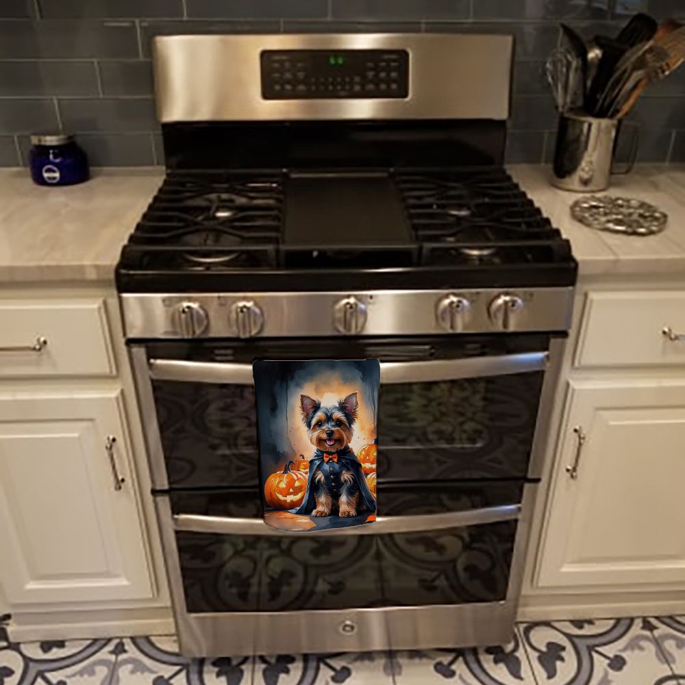 Kitchen Towel featuring breed specific Yorkshire Terrier artwork. Celebrate Halloween with this Halloween Kitchen Towel. Experience the perfect blend of aesthetic appeal and functional excellence with our Plush Velour Kitchen Towels. These are not your ordinary decorative kitchen towels that gather dust. Instead, they are designed to be as practical as they are stylish. The front layer of our towel is constructed from a minky plush polyester, known for its durability and color retention. Unlike conventional kitchen towels, the artwork on our towels is dyed directly into the fabric, ensuring vibrant colors that last. Polish your glassware to a brilliant sparkle using the plush front side of the towel. Flip to the back, crafted from 100% cotton terry loop, to exploit its exceptional absorbency for drying dishes or wiping down counters. Our kitchen towels redefine the concept of functional art, offering lasting quality that maintains the towel's shape over time. Measuring 15 inches by 25 inches and weighing 2.3 lbs per dozen, these towels deliver an overwhelming sensory experience with their soft, plush, and smooth texture. The edges are meticulously finished with binding, enhancing their durability and visual appeal. For your convenience, these towels are machine washable and can be dried on low heat. After the first wash, the top fabric becomes even softer and fluffier, eliminating the need for ironing. Treat your kitchen to the luxury and functionality it deserves with our plush velour kitchen towels.