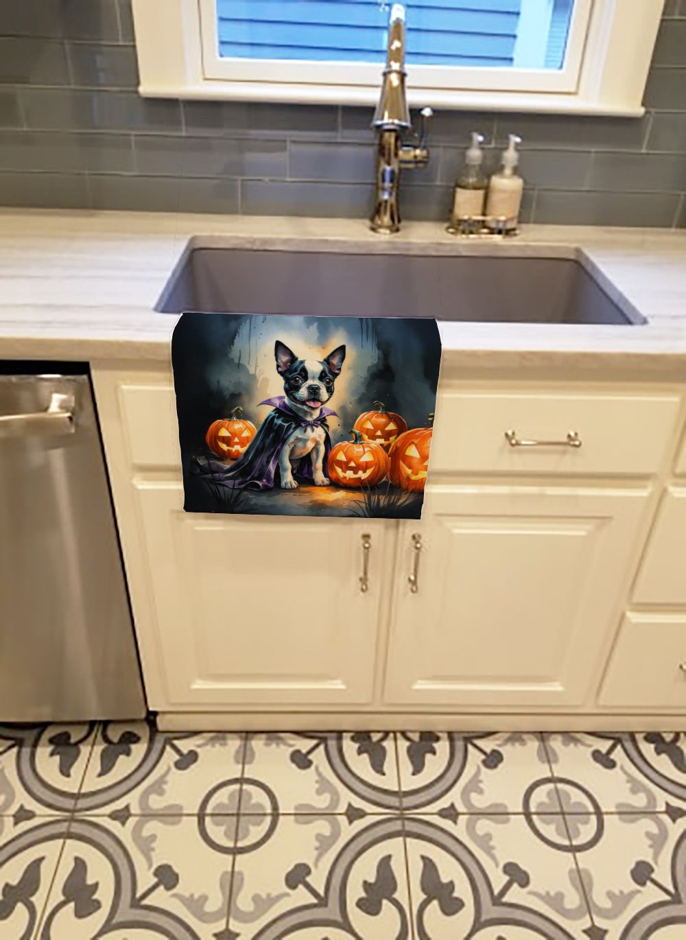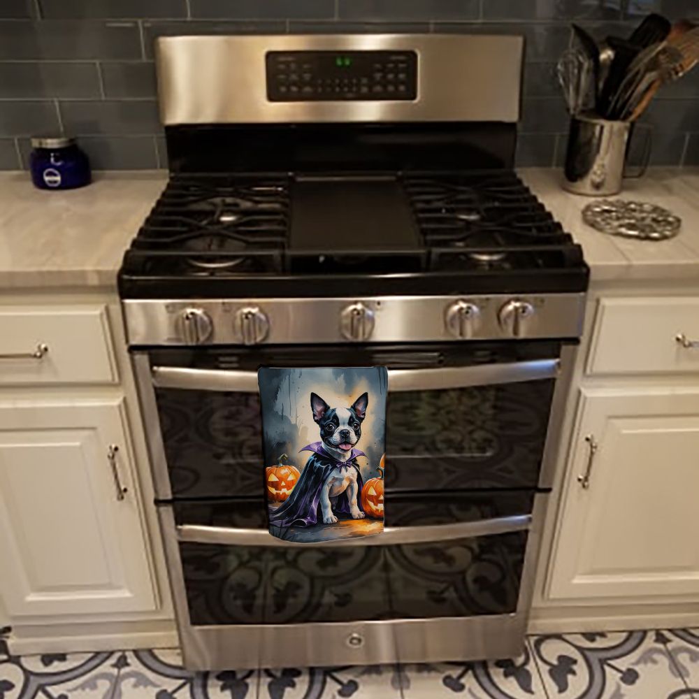 Kitchen Towel featuring breed specific Boston Terrier artwork. Celebrate Halloween with this Halloween Kitchen Towel. Experience the perfect blend of aesthetic appeal and functional excellence with our Plush Velour Kitchen Towels. These are not your ordinary decorative kitchen towels that gather dust. Instead, they are designed to be as practical as they are stylish. The front layer of our towel is constructed from a minky plush polyester, known for its durability and color retention. Unlike conventional kitchen towels, the artwork on our towels is dyed directly into the fabric, ensuring vibrant colors that last. Polish your glassware to a brilliant sparkle using the plush front side of the towel. Flip to the back, crafted from 100% cotton terry loop, to exploit its exceptional absorbency for drying dishes or wiping down counters. Our kitchen towels redefine the concept of functional art, offering lasting quality that maintains the towel's shape over time. Measuring 15 inches by 25 inches and weighing 2.3 lbs per dozen, these towels deliver an overwhelming sensory experience with their soft, plush, and smooth texture. The edges are meticulously finished with binding, enhancing their durability and visual appeal. For your convenience, these towels are machine washable and can be dried on low heat. After the first wash, the top fabric becomes even softer and fluffier, eliminating the need for ironing. Treat your kitchen to the luxury and functionality it deserves with our plush velour kitchen towels.