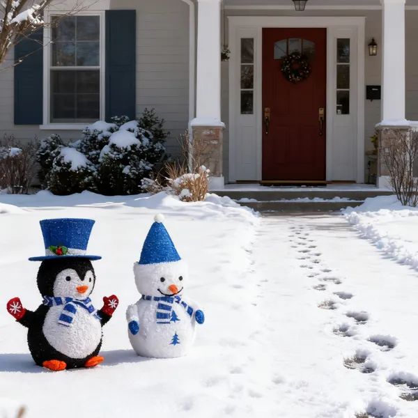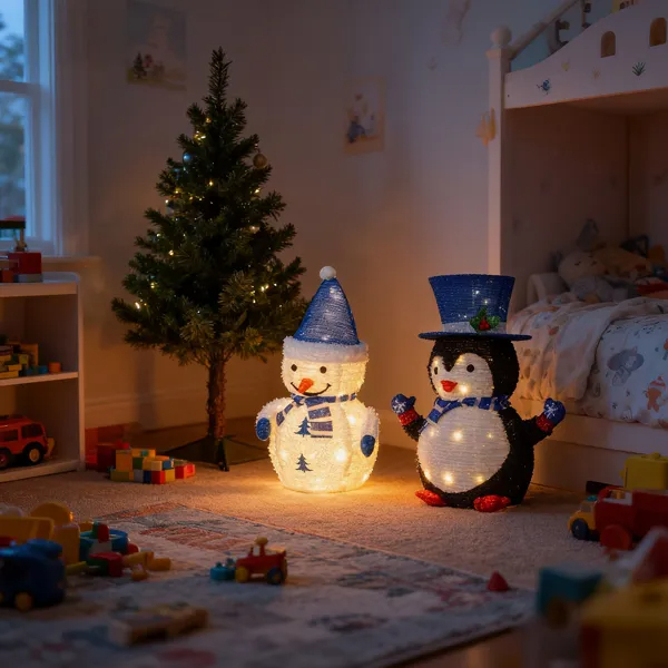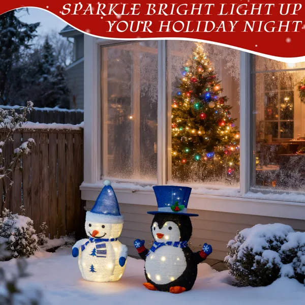 Set Of 2 Lighted Plush Penguin And Snowman Christmas Decorations, Pre-lit Pull Up Holiday Decor With 100 Warm White LED Lights For Xmas Outdoor I