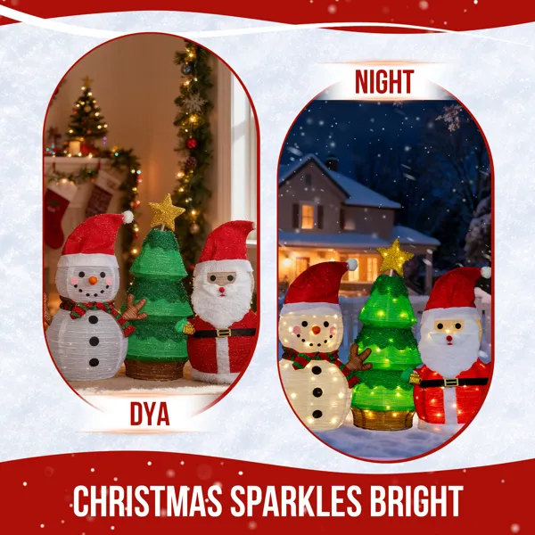 Create a warm and festive atmosphere with this enchanting set of Christmas lighted decorations. Perfect for both indoor and outdoor use, these glowing holiday displays will instantly brighten up your home, yard, or patio, making them a great addition to your seasonal décor. With durable construction and weather-resistant materials, these decorations are designed to withstand winter conditions, ensuring that they will bring holiday cheer year after year. Easy to set up and store, they provide a hassle-free way to enhance your holiday celebrations.
