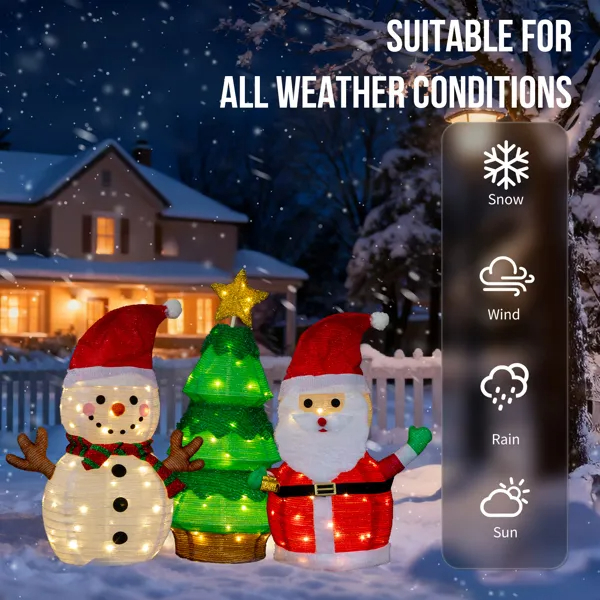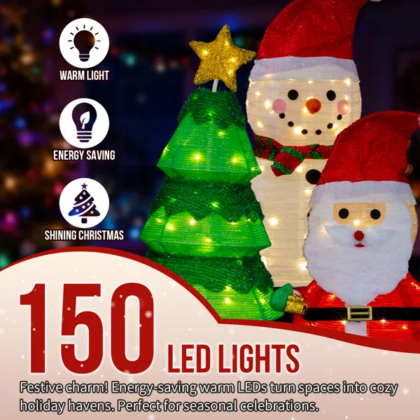 Home > Set Of 3 Lighted Santa And Snowman And Xmas Tree Christmas Decorations, Pre-lit Pull Up Holiday Decor With 150 Warm White LED Lights For Xmas Out