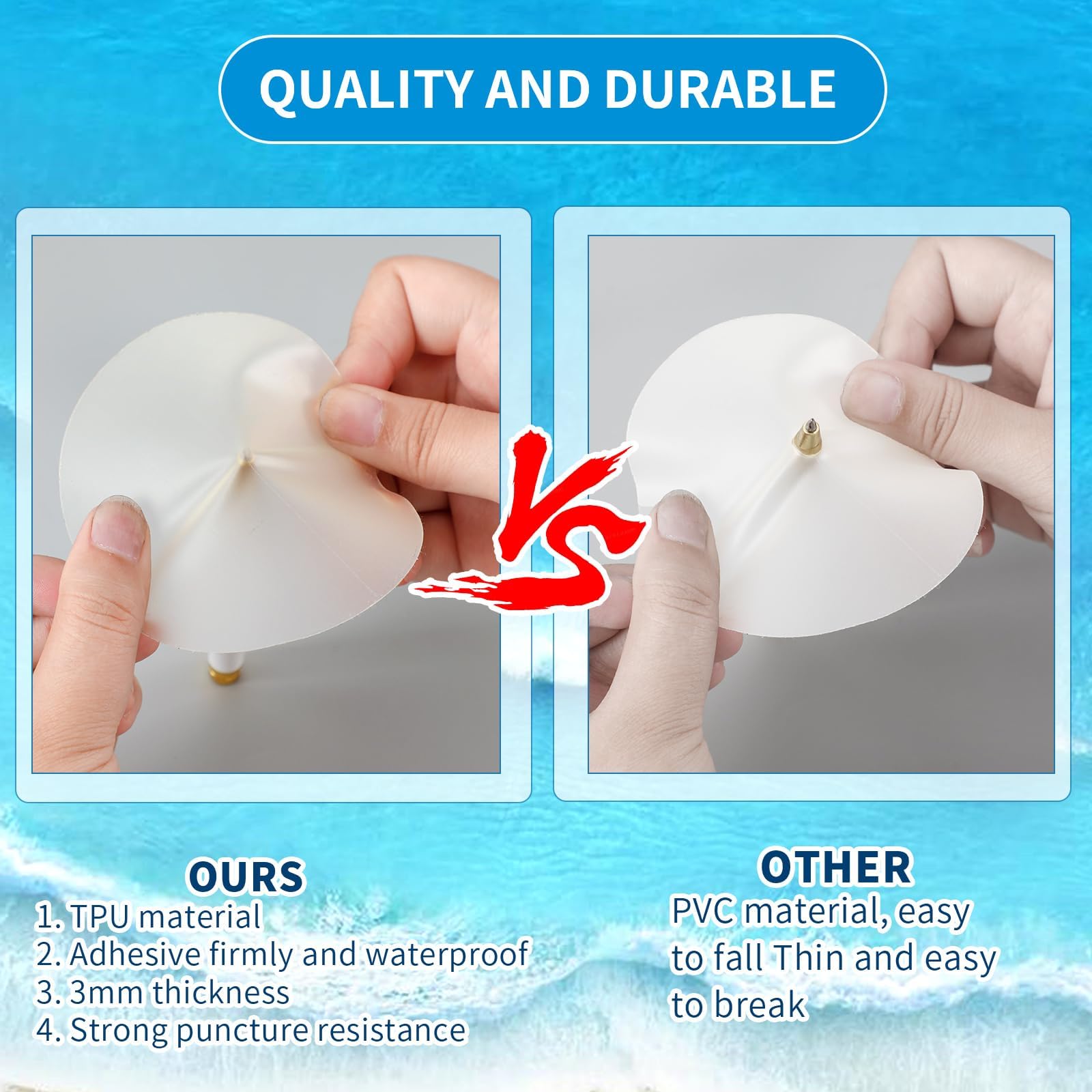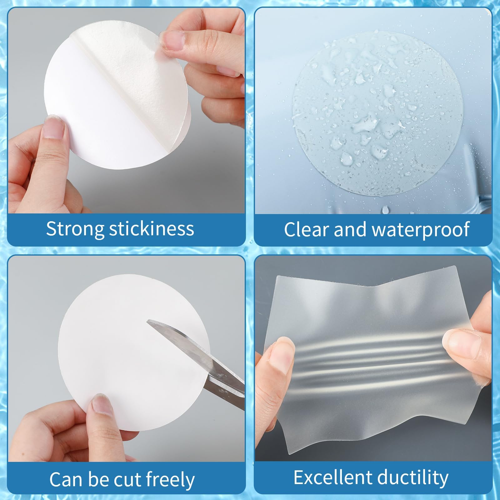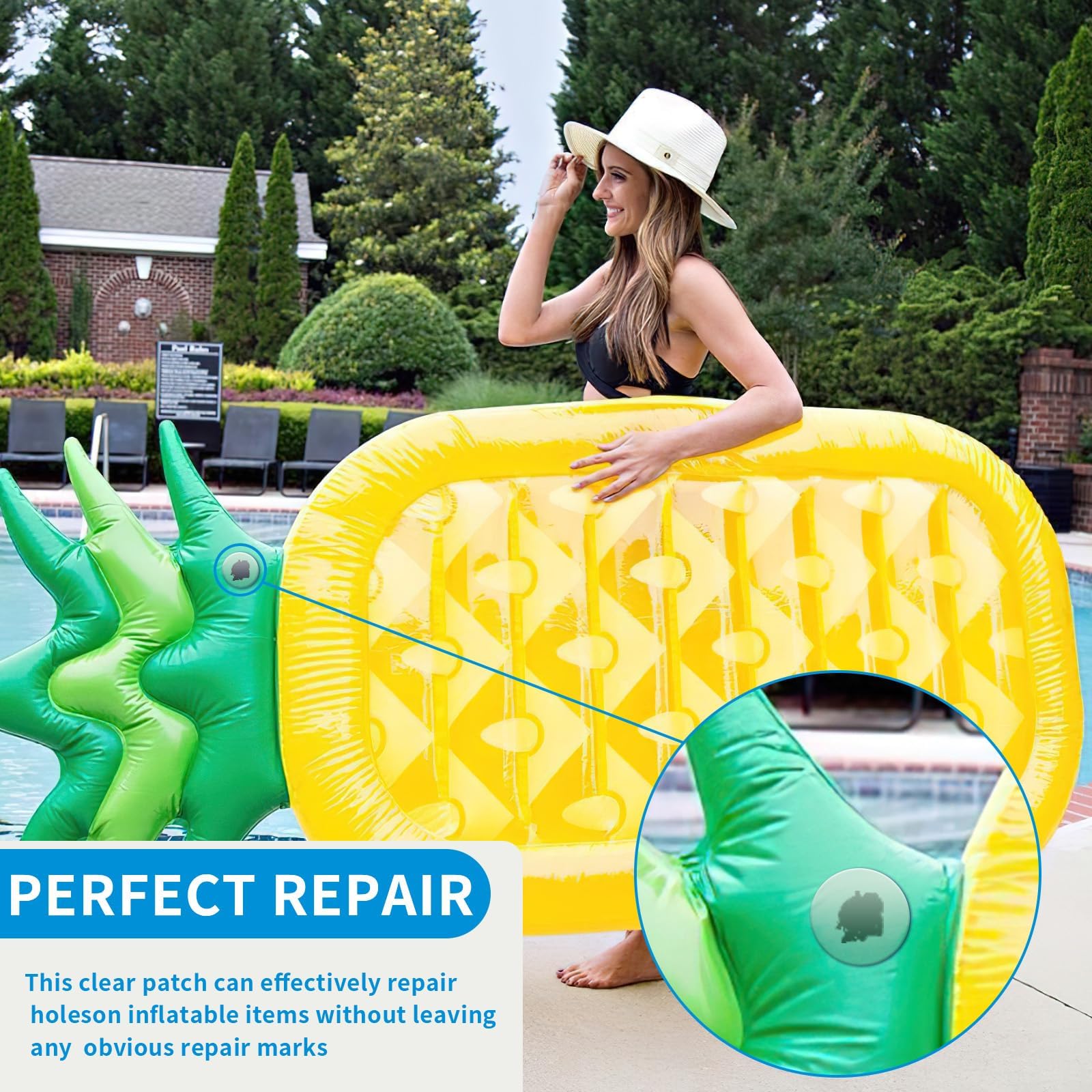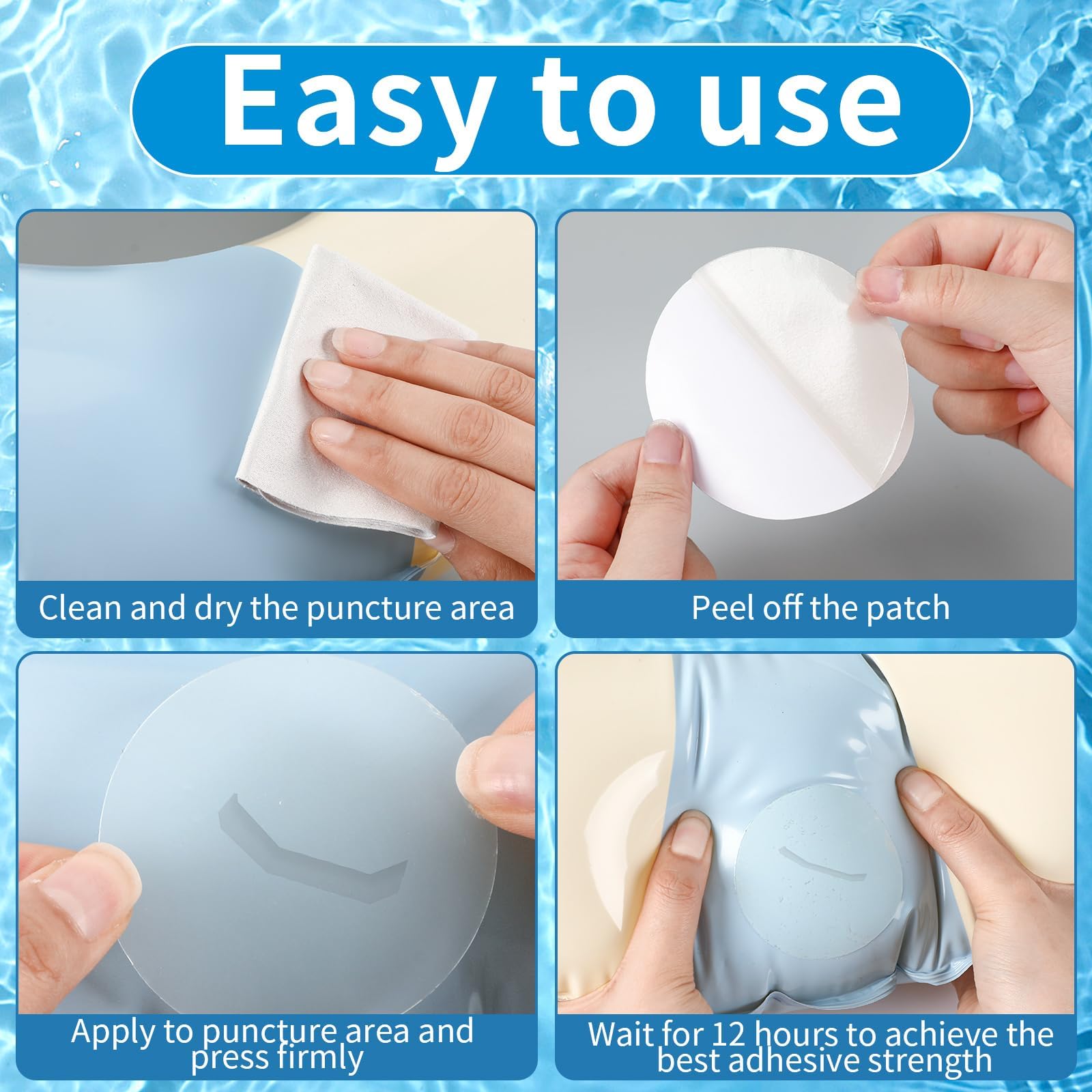 The air mattress repair patch kit is made of TPU, which has good abrasionproof and durability, can maintain the repair effect in various occasions, and is not easy to age or fall off. The repaired items can be kept in good condition for a long time, so you can use the pool patch repair kit with confidence.